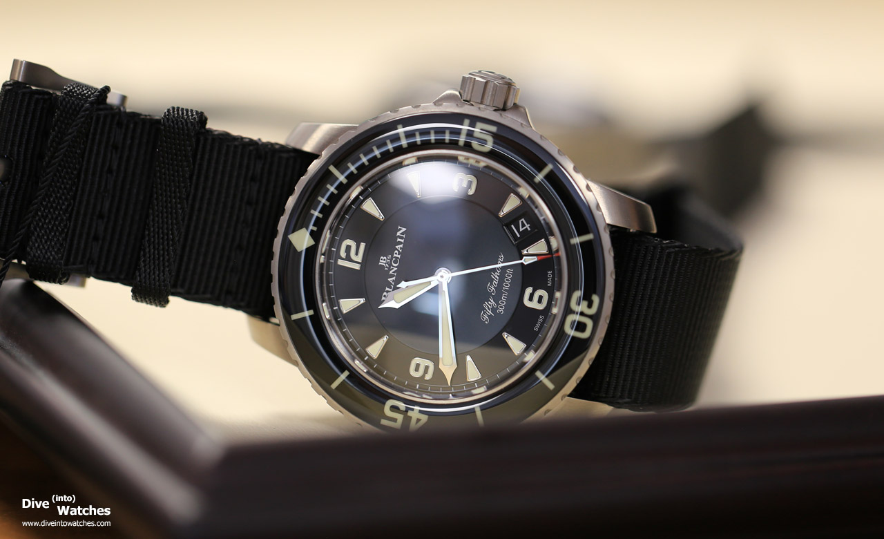 Die 2017 vorgestellte Schwester mit blauem Zifferblatt unterscheidet sich nebst Farbe auch durch den anderen Zeigersatz; hier wurde das Hauptmodell mit dem neuen Gehäusematerial ausgerüstet. Alternativ bietet Blancpain die bis 300 Meter wasserdichte Uhr auch mit dem neuen (mit Textilschlaufen ausgestatteten) Nato-Band an ( Ref. 5015-12B30-NABA). Verfügbar dürfte die Uhr im 2019 werden, preislich dürfte die Uhr erfahrungsgemäss um die 14’000 Euro liegen.
