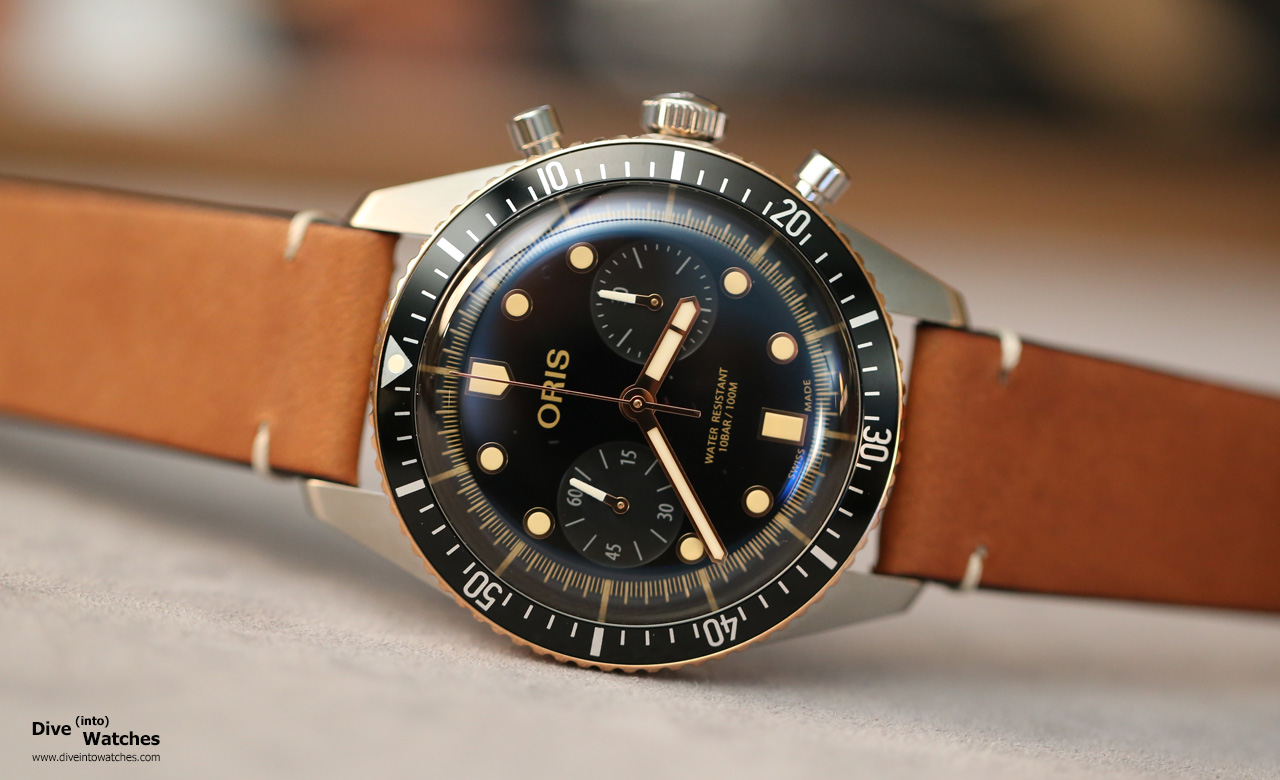 2017 hatte Oris mit dem auf 2’000 Stück limitierten Chronographen Carl Brashear (Ref. 01 771 7744 3185-Set LS) einen der schönsten Taucherchronographen seit Blancpains Bathyscaph vorgestellt. Dass davon irgendwann einmal ein unlimitiertes Modell in Edelstahl kommen könnte, lag schon fast auf der Hand, vor allem nach der Blue Edition für Bucherer im April. Das Resultat ist gelungen: Dank schwarzem Zifferblatt und farblich angepasstem Logo (bei der Bronze-Version stach das weisse Logo etwas stark hervor), Bi-Color Lünette (Bronze) und optionalem Stahlband macht die Uhr eine mehr als gute Figur am Handgelenk. Der Durchmesser bleibt bei 43 mm, im Innern tickt das Oris 771 (Basis SW 510), Wasserdichtheit liegt bei 100 Meter, die Krone ist verschraubt. Preis liegt bei CHF 3’950.00 (am Lederband). Bilder: