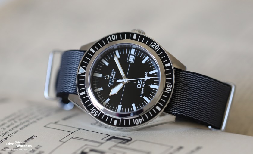 Die Taucheruhr ist bis 500 Meter wasserdicht und mit dem für Certina typischen Schildkröten-Panzer auf dem Gehäuseboden ausgestattet. Mit einem Listenpreis von CHF 860.00 ist die DS Super PH500M vergleichsweise günstig, nichtsdestotrotz wird beim Gehäusefinish (durchgehend poliert), Drehring-Inlay (Aluminium) und Zifferblatt (bedruckt) auch klar, dass das gute Preis-/Leistungsverhältnis immer noch auf einer realistischen Kalkulation beruht. Mit 14,95 mm baut die Uhr bereits recht hoch, das graue NATO-Band bringt aber sicher nochmals 2 mm mehr ans Handgelenk (wem die Uhr zu hoch baut: an einem Tropic-Band wird die Höhe etwas kaschiert, und der damals typische Look erreicht). Umgekehrt hätten eine Keramik-Lünette und aufgesetzte Indexe der Anmutung der Uhr gut getan, auch wenn dadurch der Preis näher an vier Stellen gerutscht wäre. Ebenfalls dürften sich Puristen eine etwas kleinere Schrift auf dem Zifferblatt gewünscht haben, und die Leuchtmasse wird dem Charakter einer Tool-Watch nicht gerecht.