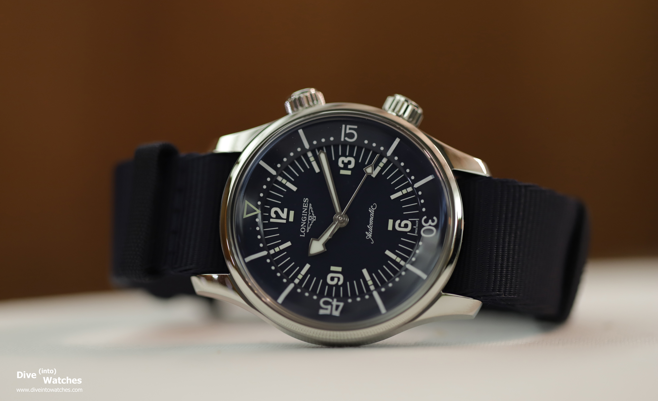 Die bis 300 Meter wasserdichte Legend Diver von Longines kriegt ein – im Vergleich zum Original von 1959 (Ref. 7042) – kompakteres Gehäuse mit 39 mm statt 42 mm Durchmesser, neue Zeiger und aufgrund der offensichtlich aufwändigeren Verarbeitung auch gleich einen neuen Listenpreis von CHF 2’800.00 am Textilband. Beim Werk setzt Longines auf das Chronometer-zertifizierte L888.6 mit 72 Stunden Gangreserve und Silizium-Spirale. Nebst der aktuell sehr populären Grösse verzichtet die Legend Diver zudem auf ein Datumsfenster: