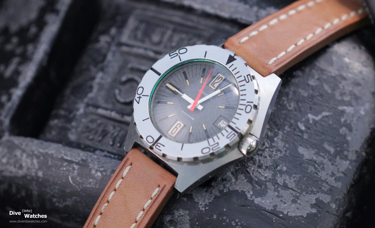 Die als „Super-Taucheruhr“ beworbene Uhr zählt unbestritten zu den Kandidaten regelmässig auftauchender 70er-Jahre Brocken, die ihr Geheimnis oder ihre Geschichte nur zögerlich preisgeben: Die Typhoon von Sandoz. Einerseits ist da alleine schon die Tatsache, dass es sich um eine punkto Form und Bauweise unübliche Uhr handelt, andrerseits verfügt sie über eine Besonderheit, die man sonst sehr selten sieht: Eine dezentral platzierte Schraube auf der Rückseite des Monocoque-Gehäuses.