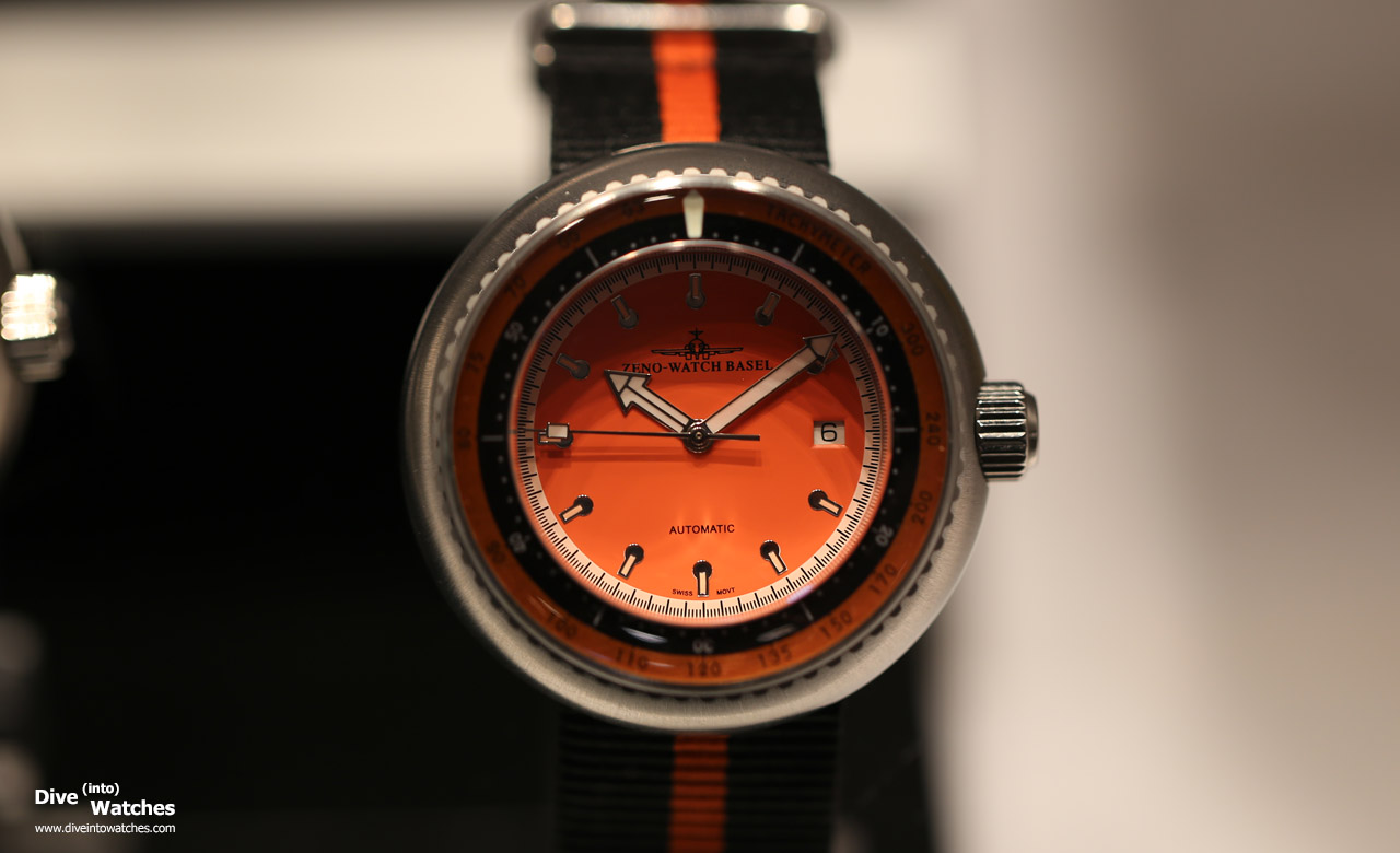 Zeno hat in Basel vier Prototypen eines bis 500 Meter wasserdichten Modells auf ETA-Basis gezeigt, das sich bei der Farbwahl und Gehäusegestaltung an der Caribbean 2000 „Discosub“ (Ref. 709) orientiert (aber nicht in Einschalenbauweise umgesetzt worden ist). Prototyp heisst in dem Fall, dass bspw. auf der Krone noch blauer Schutzlack zu sehen ist und je…