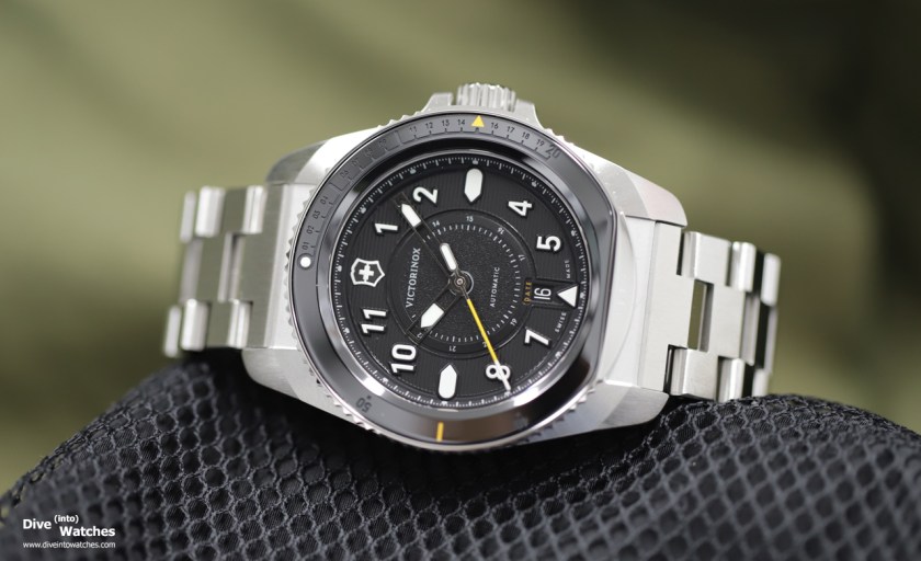 Die Taucher- resp. Outdoor-Uhr sticht vor allem durch ein paar unerwartete Details hervor: Da wären einmal die ungewöhnlich platzierten Texte wie bspw. der Hinweis aufs Gehäusematerial bei 8 Uhr auf der Gehäuseseite (inspiriert von den Klingen der Taschenmesser der Marke), die Wasserdichtheit seitlich an der Lünette bei 3 Uhr, die Bandanstossbreite auf dem Band oder seitlich an der Schliesse der Victorinox-Schriftzug. Dazu kommen auch gut gemeinte Texte wie der oberhalb des Datumsfensters bei 6 Uhr (gut, dass wir geklärt haben, dass es sich hier um ein Datum handelt). Die etwas leichtgängige, einseitig drehbare Lünette mit Keramik-Einlage kommt mit einer nach innen abfallenden Kante, die Gravuren sind mehrheitlich ohne Farbe ausgeführt (und enorm klein), aussen bei 6 Uhr flacht das Ganze ab fürs Gründungsjahr des Unternehmens.